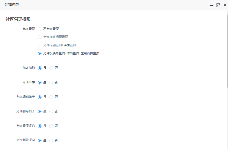 允许置顶:可选择允许版块内标题置顶、版块内详情置顶、首页置顶或者不选择置顶;