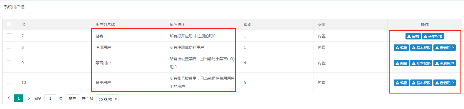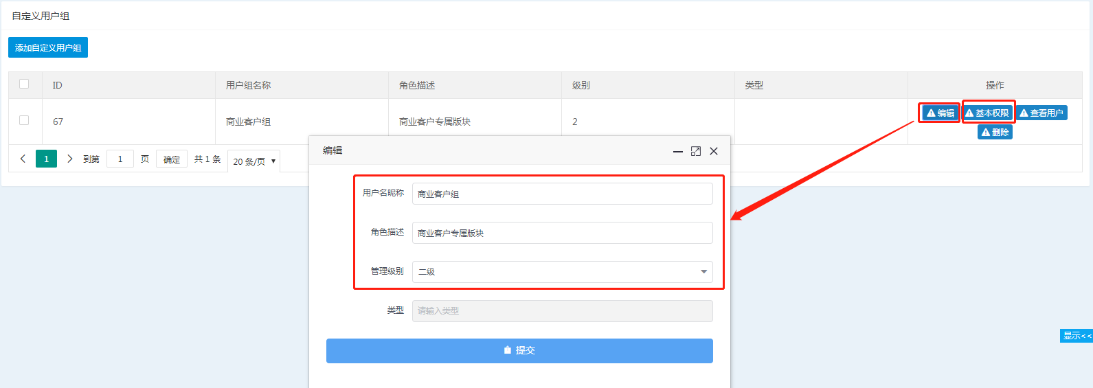 管理后台可编辑自定义用户组名称、角色描述,级别(建议2级),赋予自定义用户组基本权限。