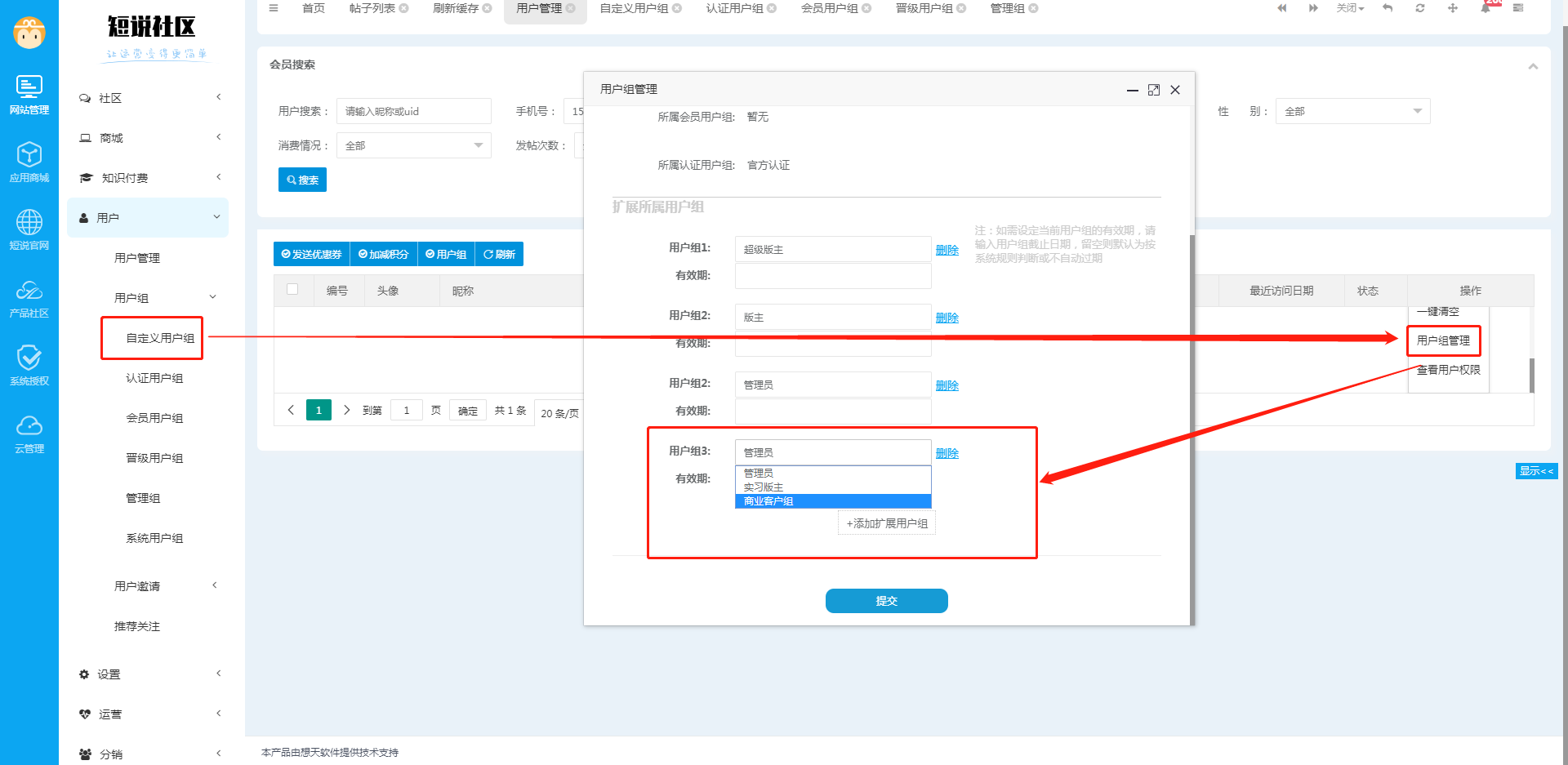 管理组包含管理员、超级版主、版主三个用户组。在管理后台--用户管理中,将一个用户归类至管理员用户组,就可以在管理员用户组中查看该用户;对于版主和超级版主,将一个用户设置为版主/超级版主后,系统会自动归类,在版主/超级版主用户组中就能查看这个用户了。