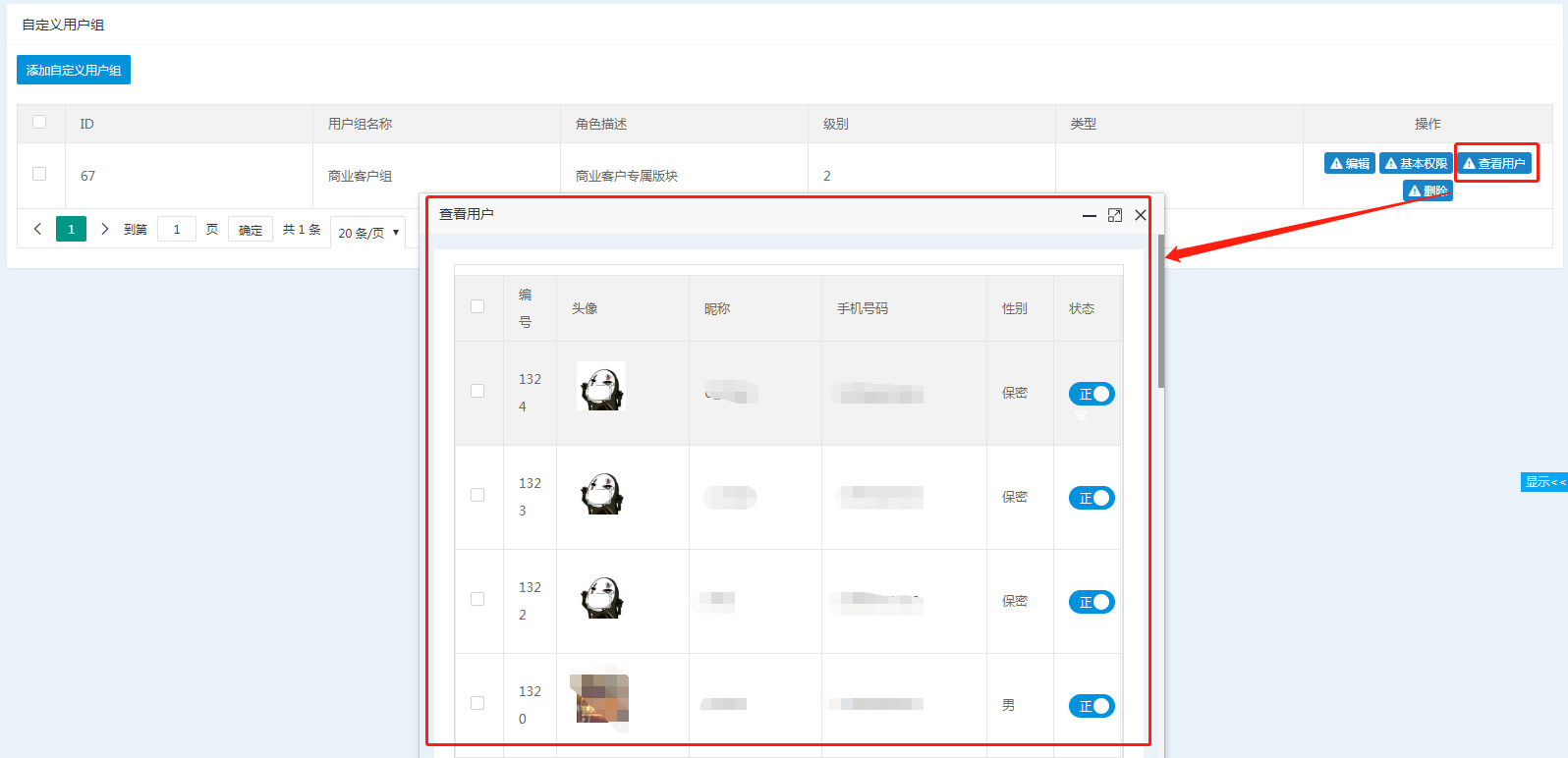 在管理后台--用户管理列表中,点击操作栏中的用户组管理,可将此用户设置不同用户组。