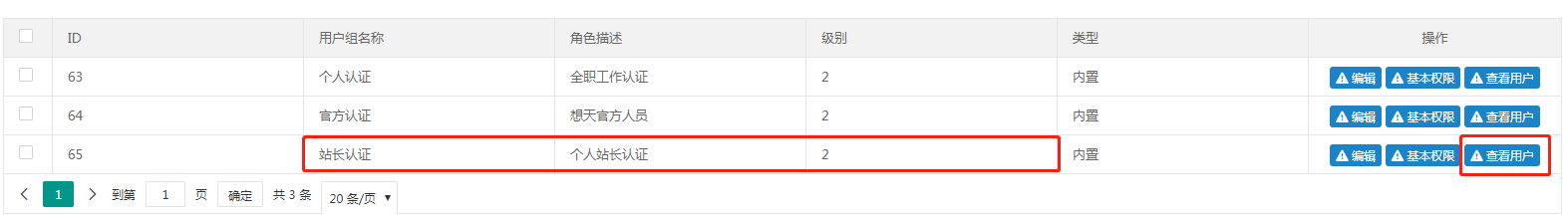 与认证用户组一样,可以编辑管理组的名称和角色描述,可以赋予管理组不同基本权限和管理权限(管理权限仅管理组拥有);可以点击查看用户按钮查看管理组用户。