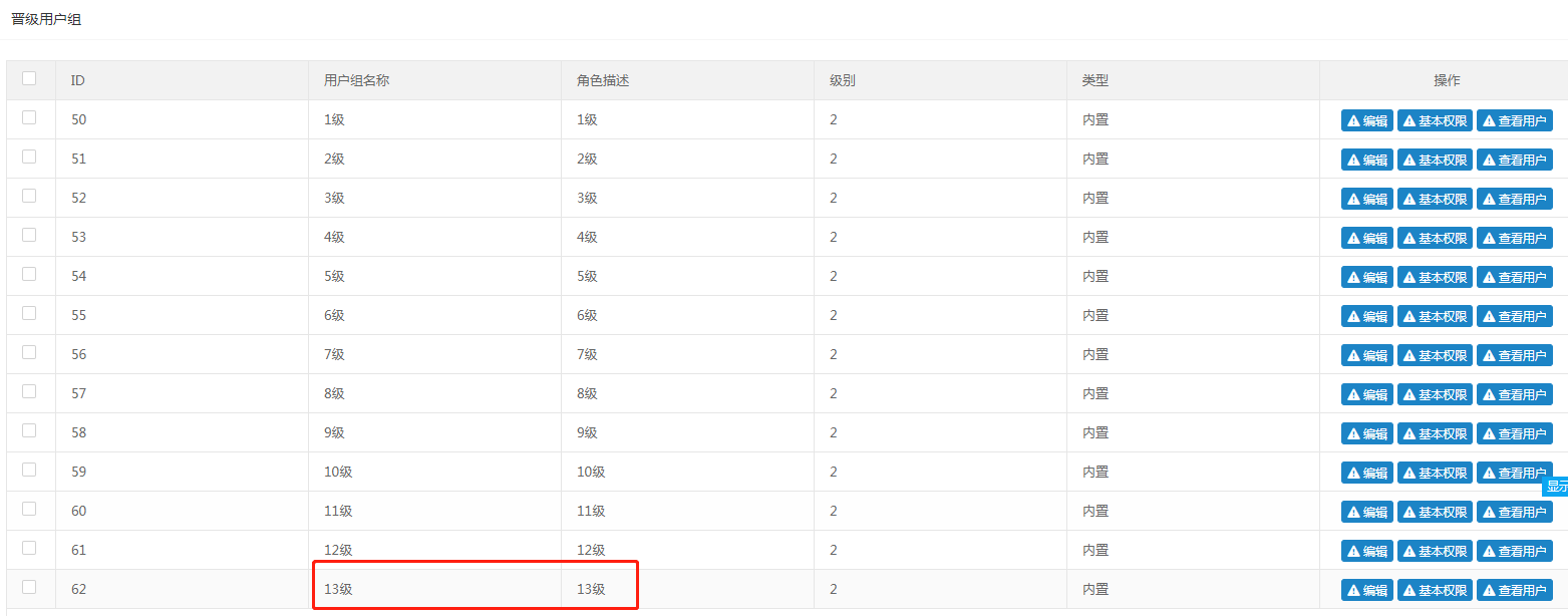 与认证用户组一样,可以编辑晋级用户组名称,可以设置晋级用户组基本权限,可以查看不同等级用户组中的用户(例如:一个用户系统会员等级是10级,那这个用户默认属于10级用户组);