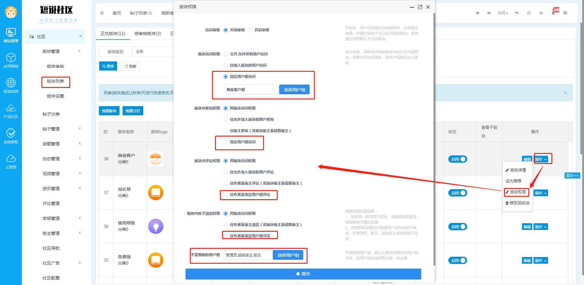 用户组目前主要和版块权限功能关联,一个版块可设置不同用户组访问权限、发帖权限、评论权限、版块内帖子浏览权限以及不受限制的用户组。