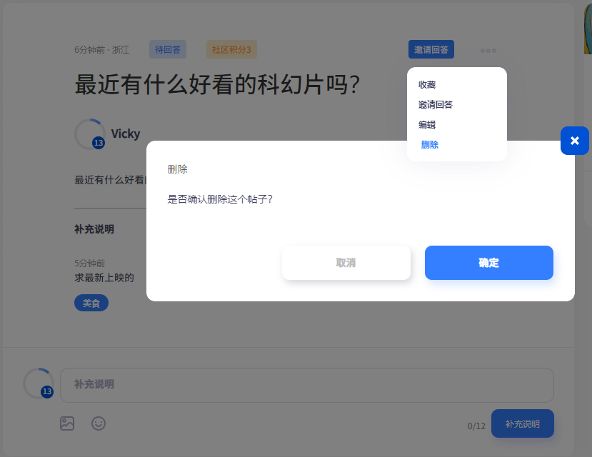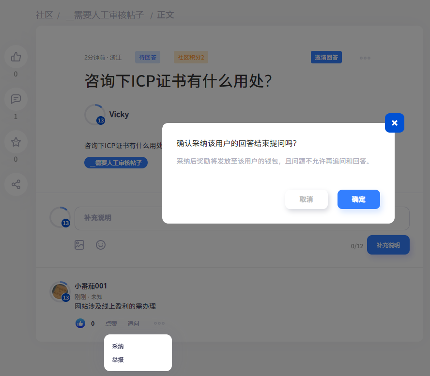 支持用户前台发布问题帖,问题帖标题(必填)、说明(选填)、支持添加图片、选择版块(可不选)、支持增加悬赏奖励、支持匿名发布。问题无回答时支持再次编辑问题。